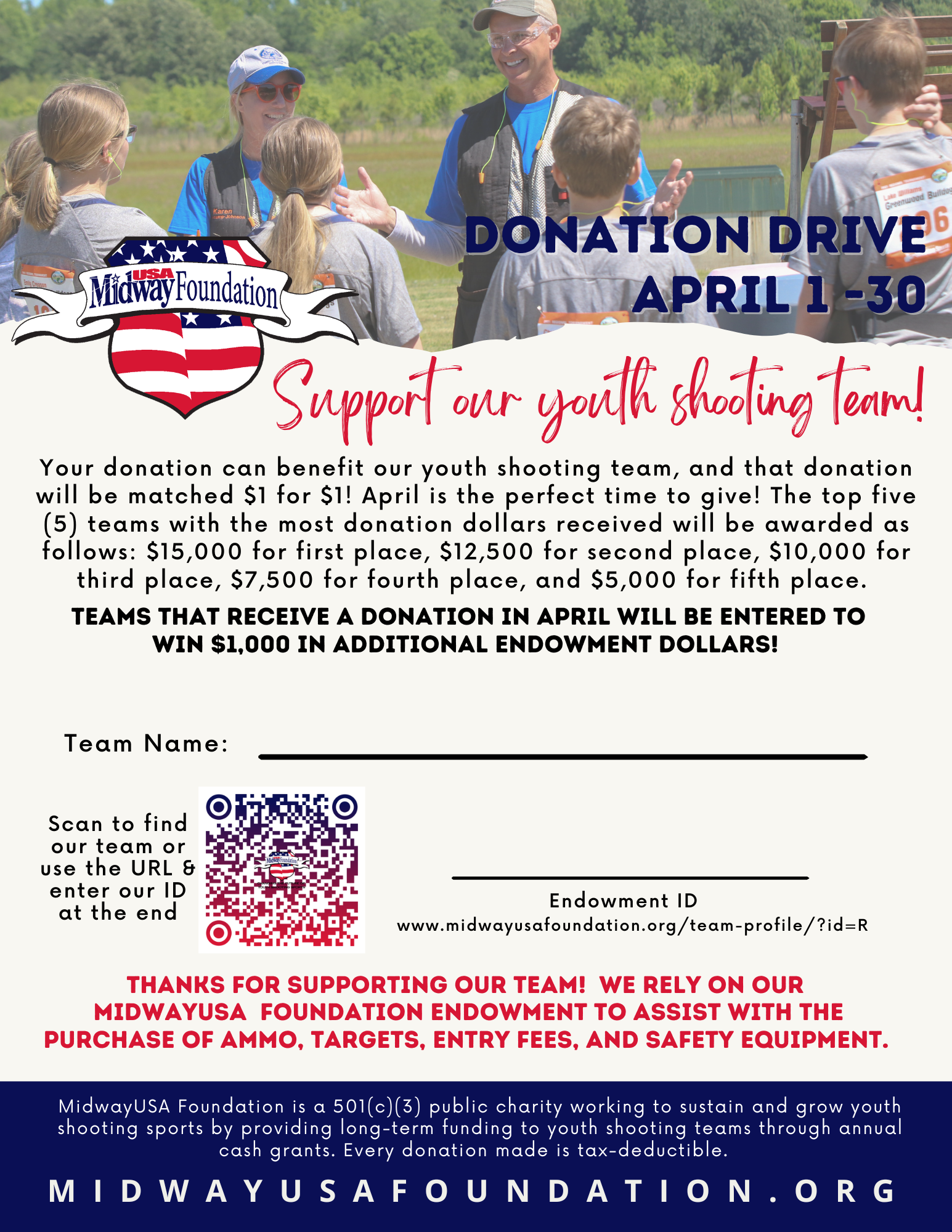 MidwayUSA Foundation presents the Spring Donation Drive, a fundraising event that allows teams to grow their endowment early in the year. Every donation qualifies, giving every team the chance to win our fundraising competition. We’ll award the top five fundraising teams and draw 30 participating teams to win $1,000 each.